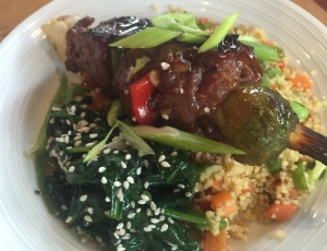 Place small mound of couscous next to a small mound of sesame spinach and place cooked babobs over the top.